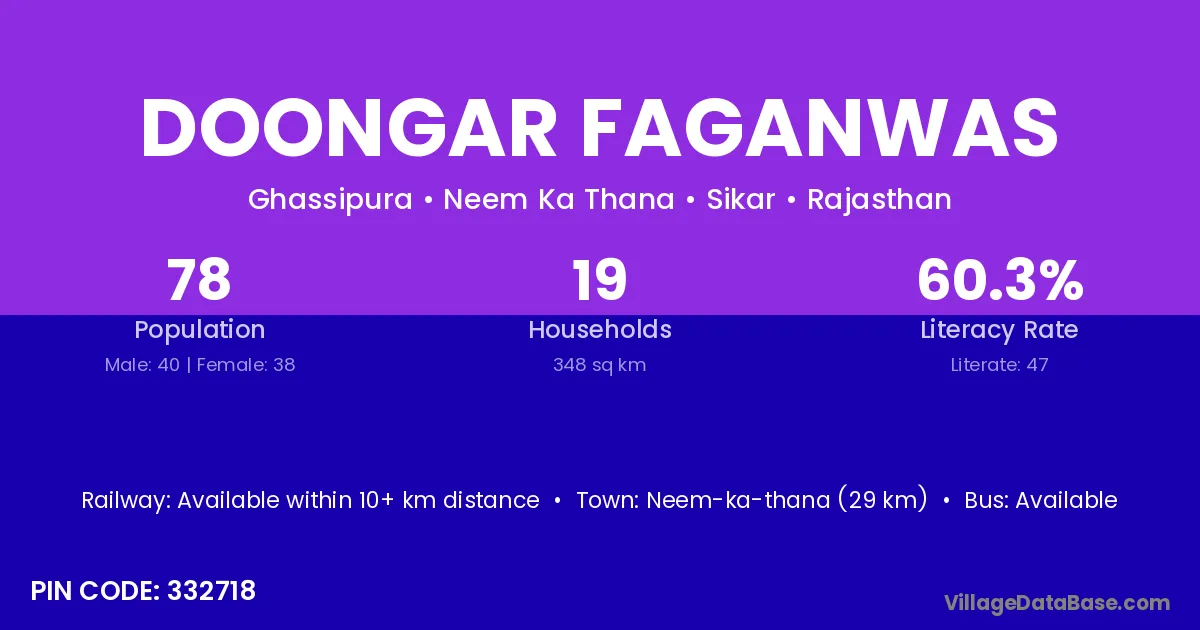 Doongar Faganwas village has a total population of 78 people, of which 40 are males and 38 are females.