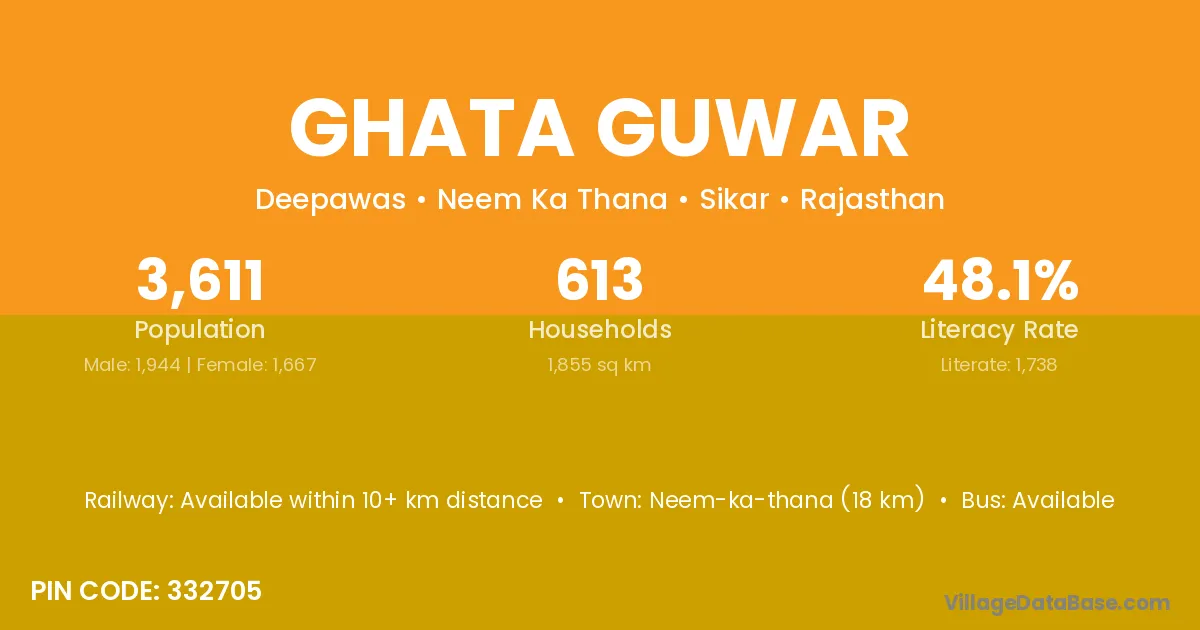 Neem-ka-thana (18 km) is the nearest town to Ghata Guwar village for major economic activities and is located approximately 18 km away.