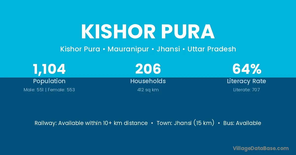 The literacy rate of Kishor Pura village is 52.86%. Male literacy stands at 64.45% and female literacy at 39.00%.