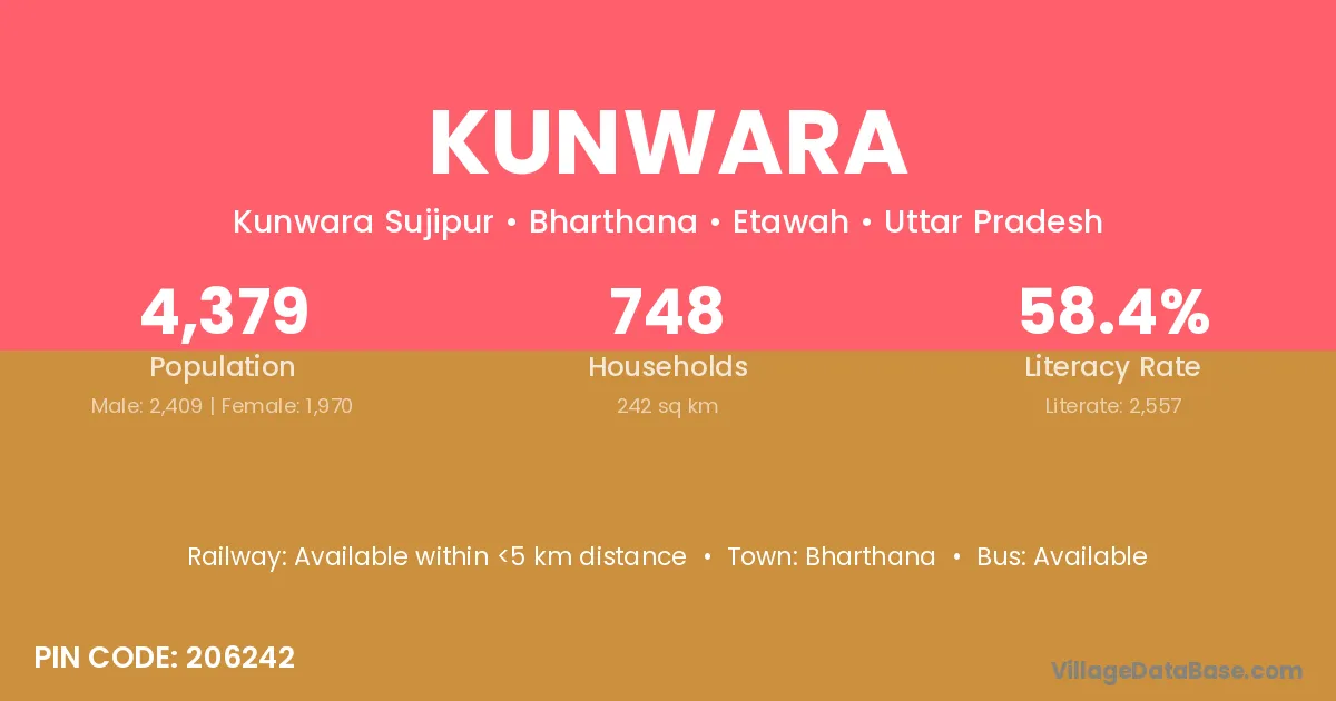 Kunwara village has a total population of 477 people, of which 267 are males and 210 are females.