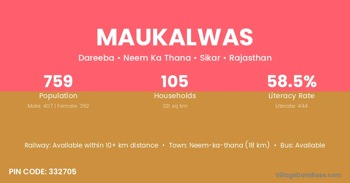 Neem-ka-thana (18 km) is the nearest town to Maukalwas village for major economic activities and is located approximately 18 km away.