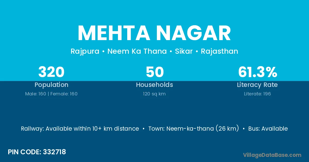 Neem-ka-thana (26 km) is the nearest town to Mehta Nagar village for major economic activities and is located approximately 26 km away.