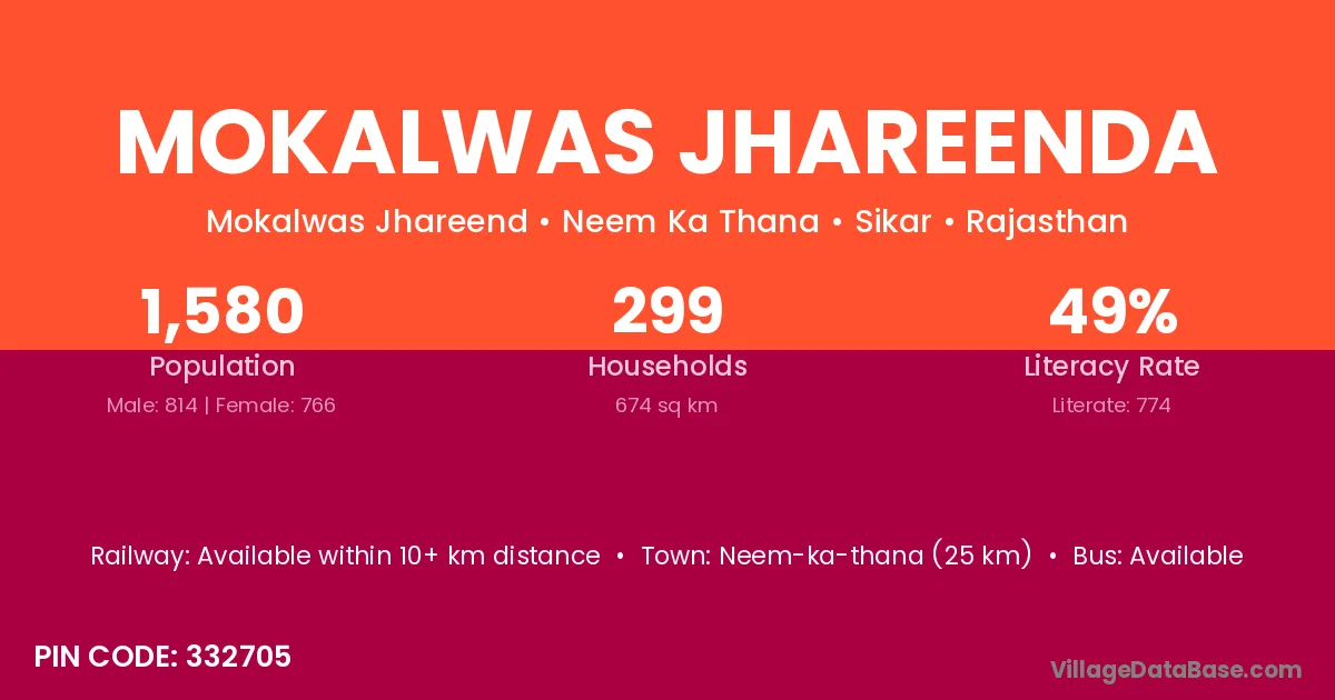 Neem-ka-thana (25 km) is the nearest town to Mokalwas Jhareenda village for major economic activities and is located approximately 25 km away.