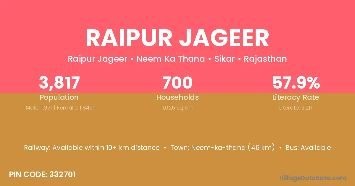 Neem-ka-thana (46 km) is the nearest town to Raipur Jageer village for major economic activities and is located approximately 46 km away.