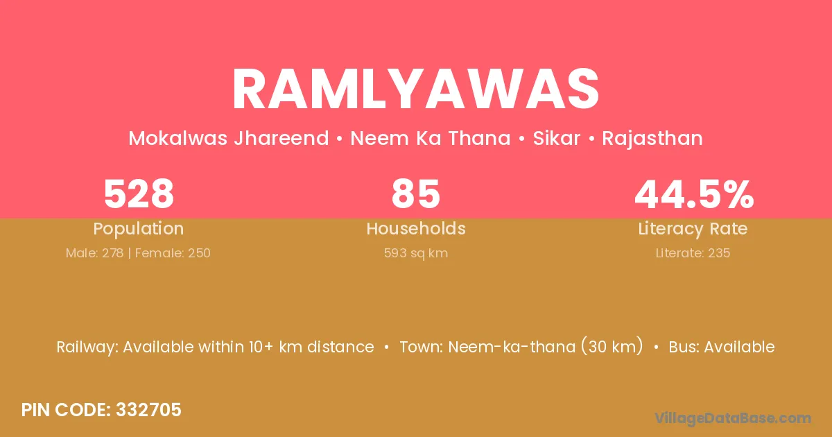 Neem-ka-thana (30 km) is the nearest town to Ramlyawas village for major economic activities and is located approximately 30 km away.
