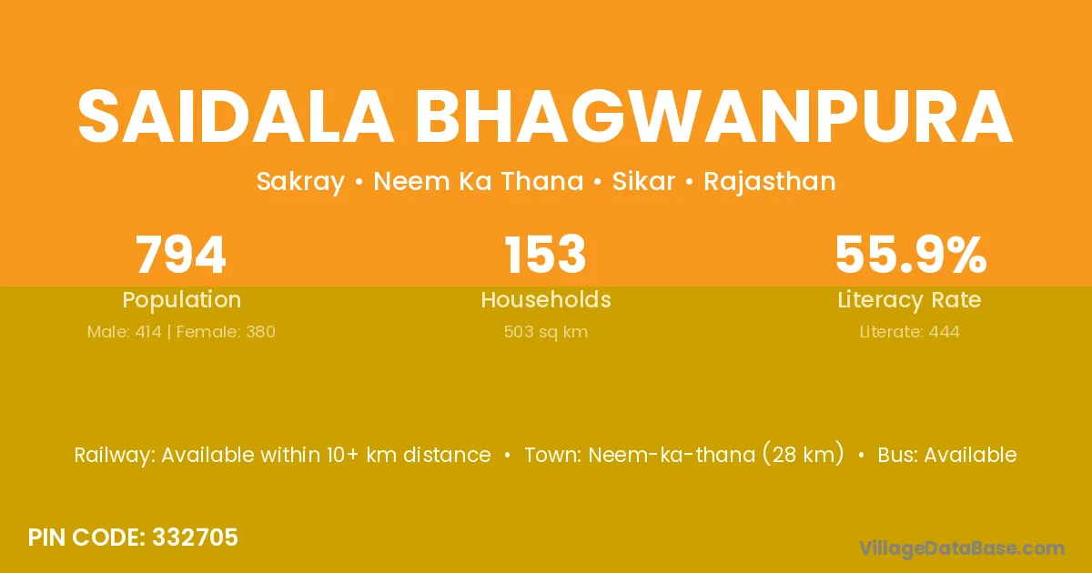 Neem-ka-thana (28 km) is the nearest town to Saidala Bhagwanpura village for major economic activities and is located approximately 28 km away.