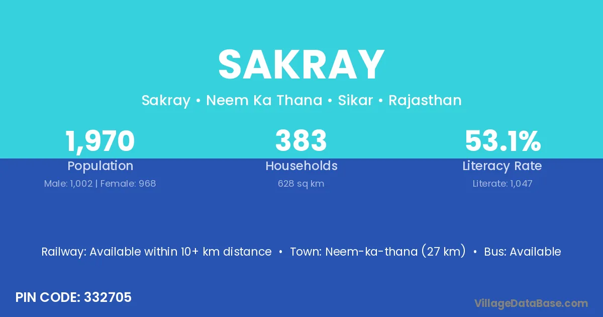 Neem-ka-thana (27 km) is the nearest town to Sakray village for major economic activities and is located approximately 27 km away.