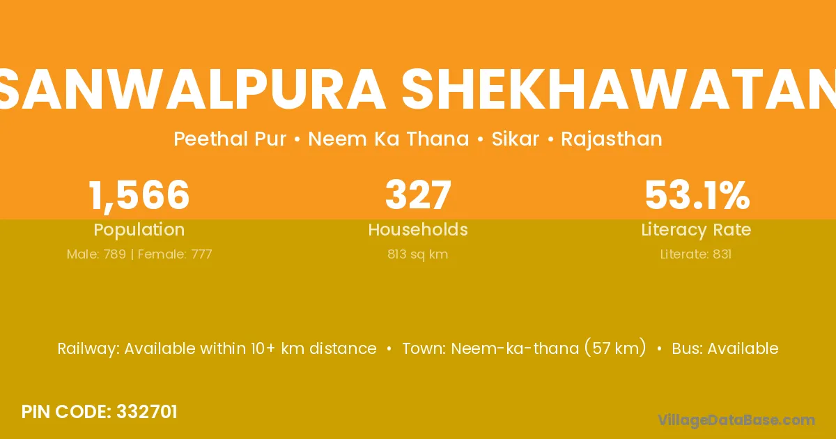 Neem-ka-thana (57 km) is the nearest town to Sanwalpura Shekhawatan village for major economic activities and is located approximately 57 km away.