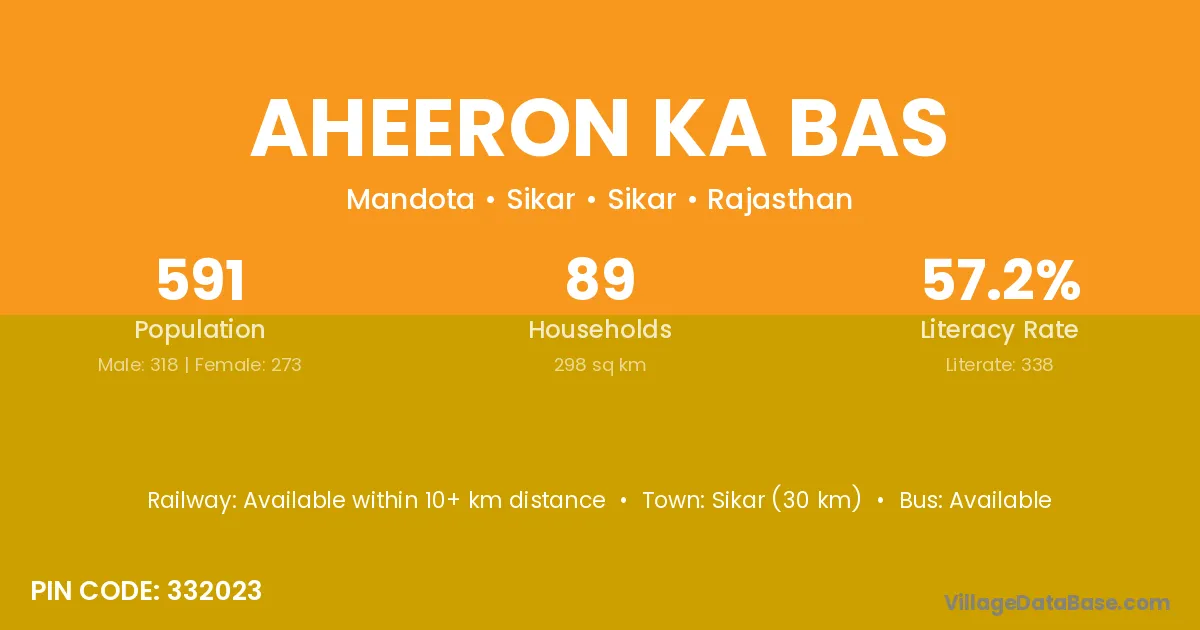 Sikar (30 km) is the nearest town to Aheeron Ka Bas village for major economic activities and is located approximately 30 km away.