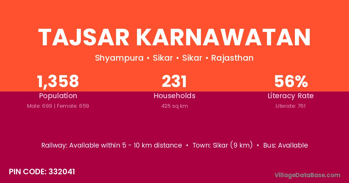 Sikar (9 km) is the nearest town to Tajsar Karnawatan village for major economic activities and is located approximately 9 km away.