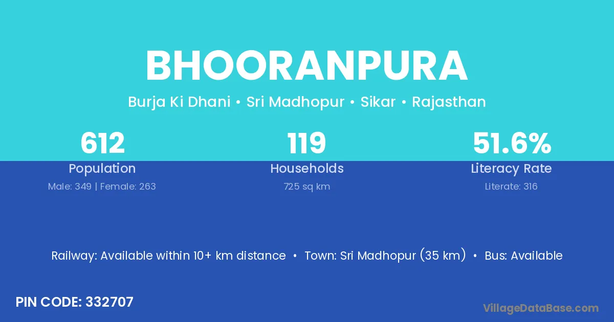 Sri Madhopur (35 km) is the nearest town to Bhooranpura village for major economic activities and is located approximately 35 km away.