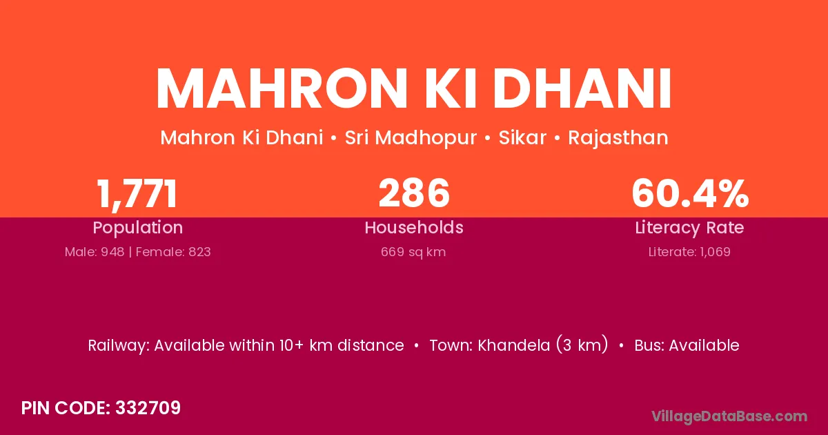 Khandela (3 km) is the nearest town to Mahron Ki Dhani village for major economic activities and is located approximately 3 km away.