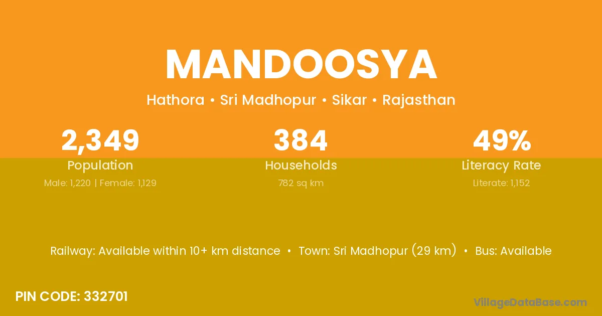 Sri Madhopur (29 km) is the nearest town to Mandoosya village for major economic activities and is located approximately 29 km away.