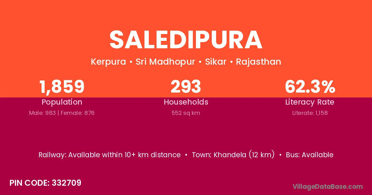 Khandela (12 km) is the nearest town to Saledipura village for major economic activities and is located approximately 12 km away.