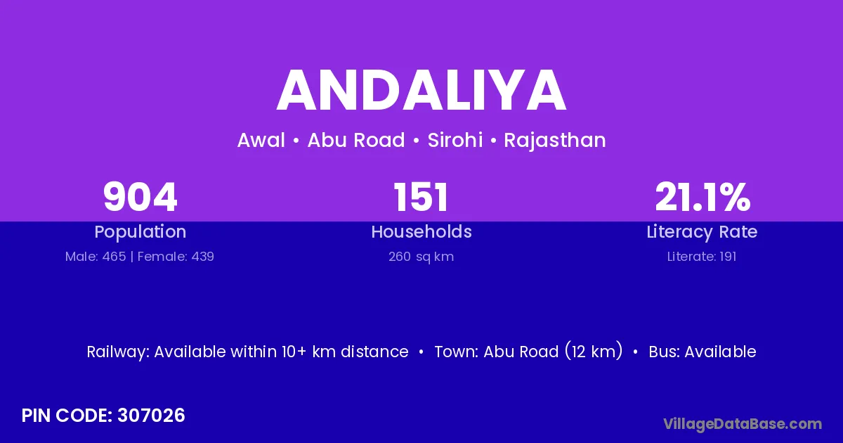 Abu Road (12 km) is the nearest town to Andaliya village for major economic activities and is located approximately 12 km away.