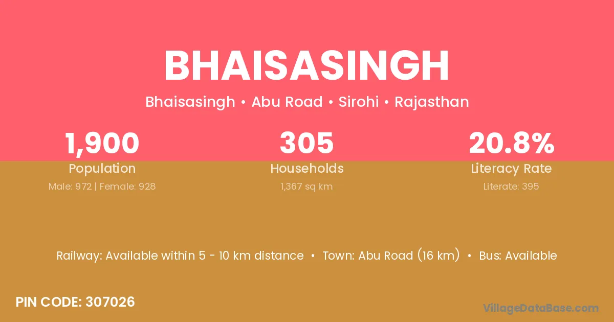 Abu Road (16 km) is the nearest town to Bhaisasingh village for major economic activities and is located approximately 16 km away.