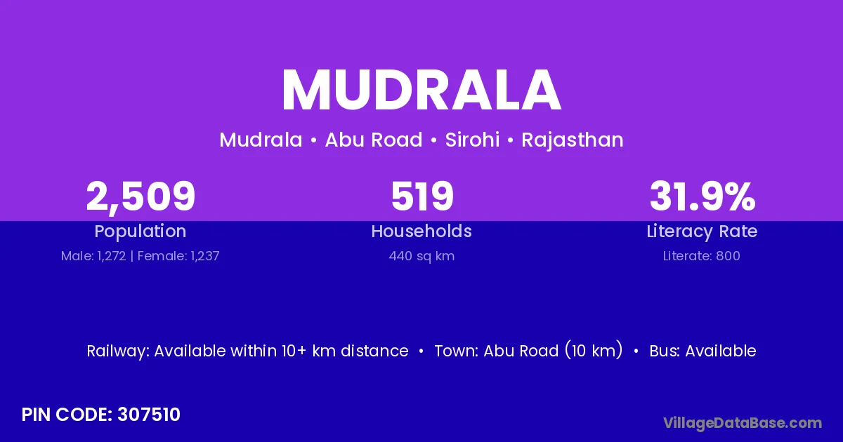 Abu Road (10 km) is the nearest town to Mudrala village for major economic activities and is located approximately 10 km away.