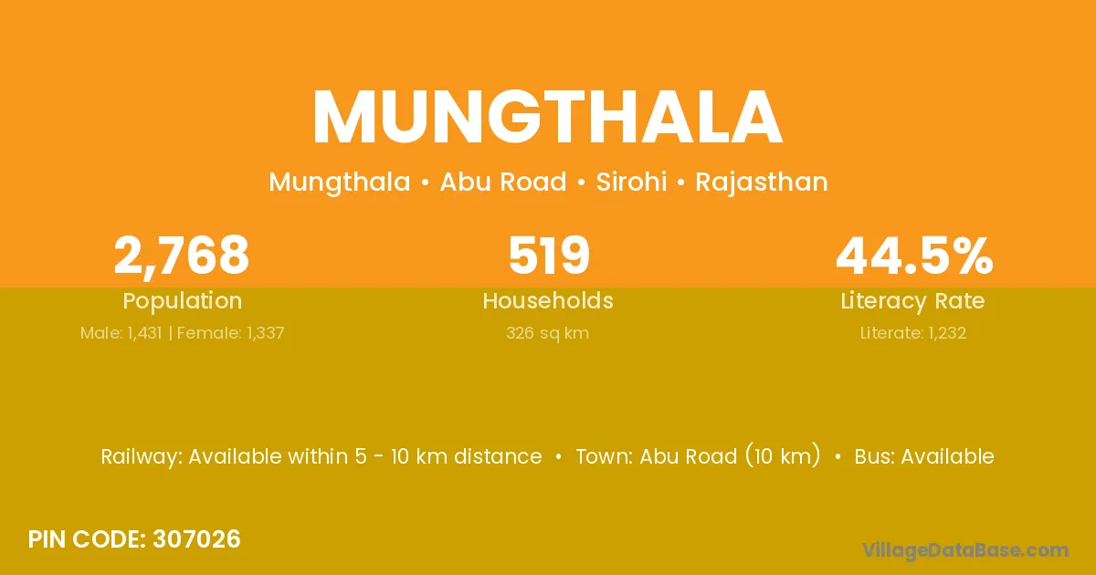 Abu Road (10 km) is the nearest town to Mungthala village for major economic activities and is located approximately 10 km away.