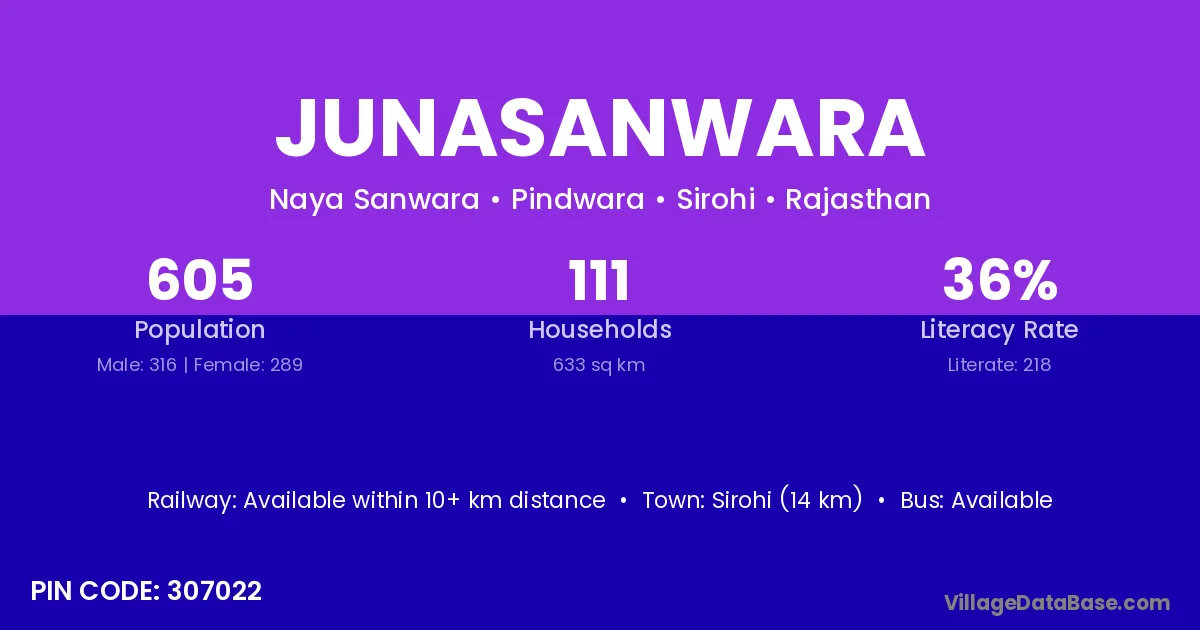 Sirohi (14 km) is the nearest town to Junasanwara village for major economic activities and is located approximately 14 km away.