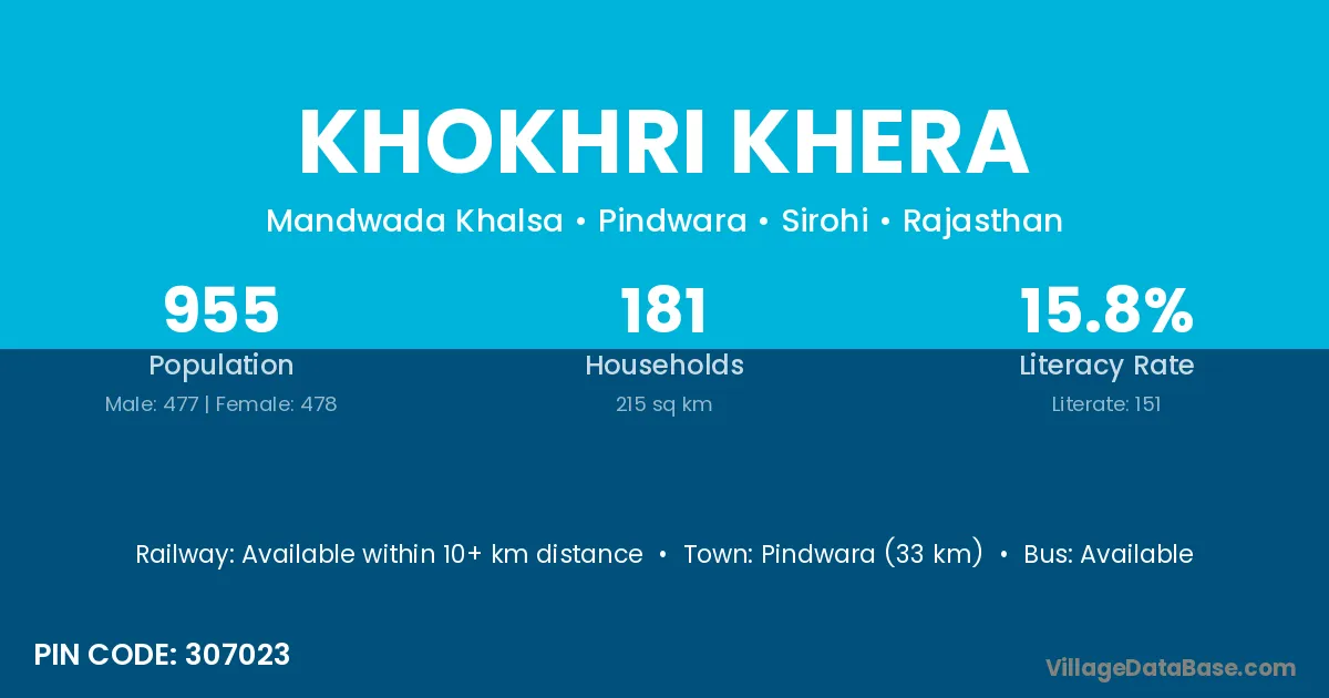 Pindwara (33 km) is the nearest town to Khokhri Khera village for major economic activities and is located approximately 33 km away.