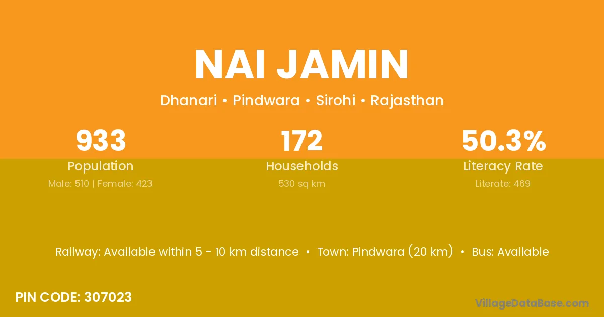Pindwara (20 km) is the nearest town to Nai Jamin village for major economic activities and is located approximately 20 km away.