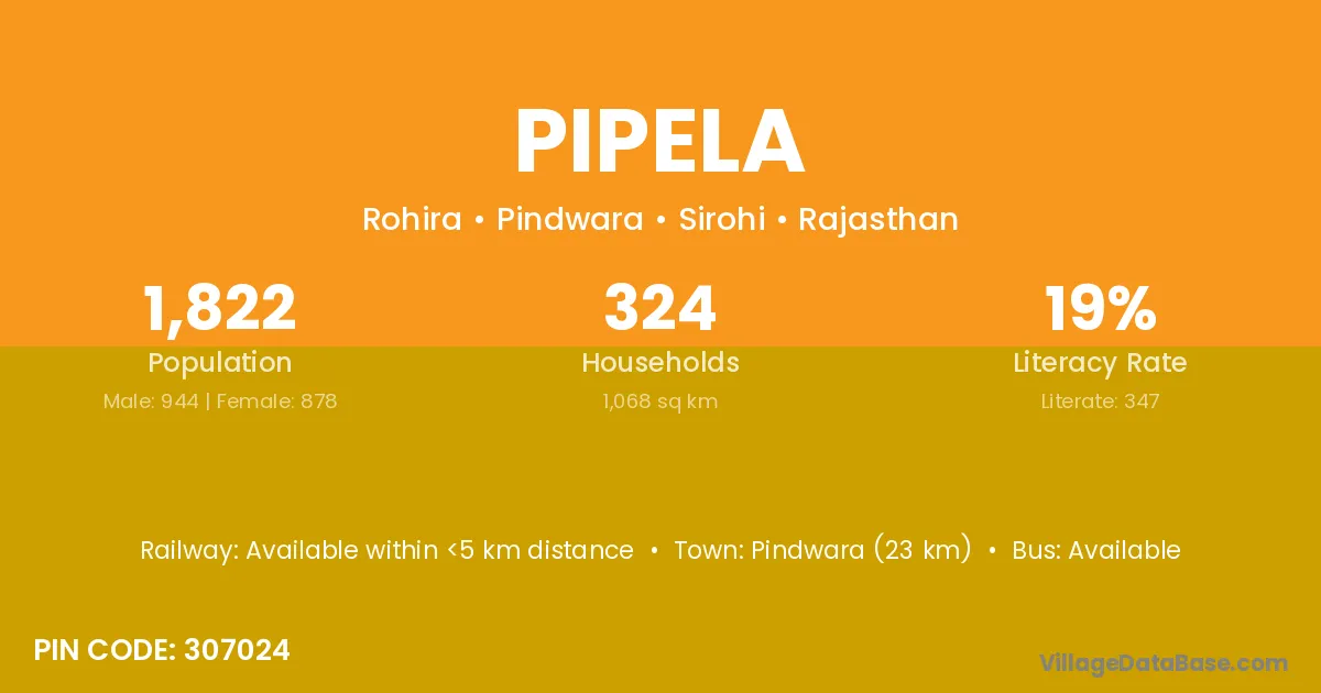 Pindwara (23 km) is the nearest town to Pipela village for major economic activities and is located approximately 23 km away.