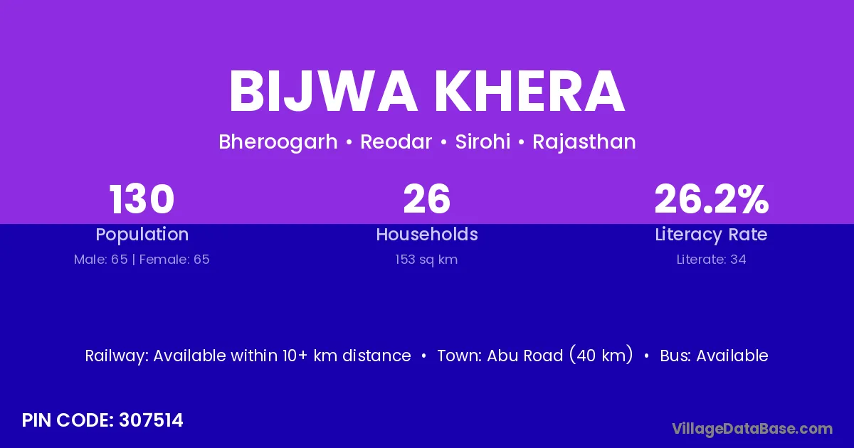 Abu Road (40 km) is the nearest town to Bijwa Khera village for major economic activities and is located approximately 40 km away.