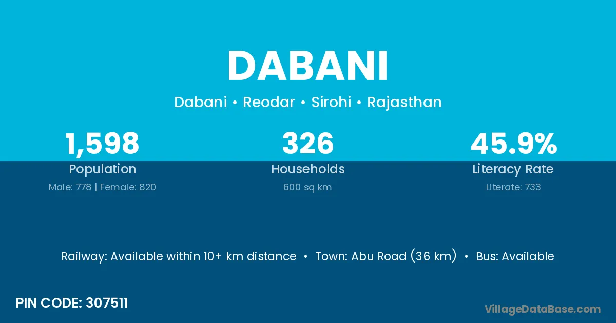Abu Road (36 km) is the nearest town to Dabani village for major economic activities and is located approximately 36 km away.
