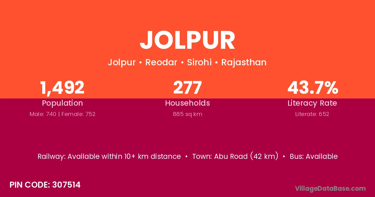 Abu Road (42 km) is the nearest town to Jolpur village for major economic activities and is located approximately 42 km away.