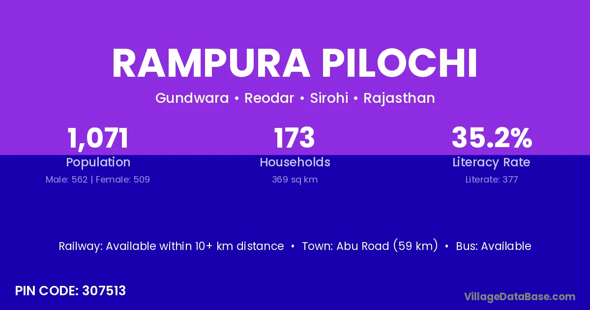 Abu Road (59 km) is the nearest town to Rampura Pilochi village for major economic activities and is located approximately 59 km away.
