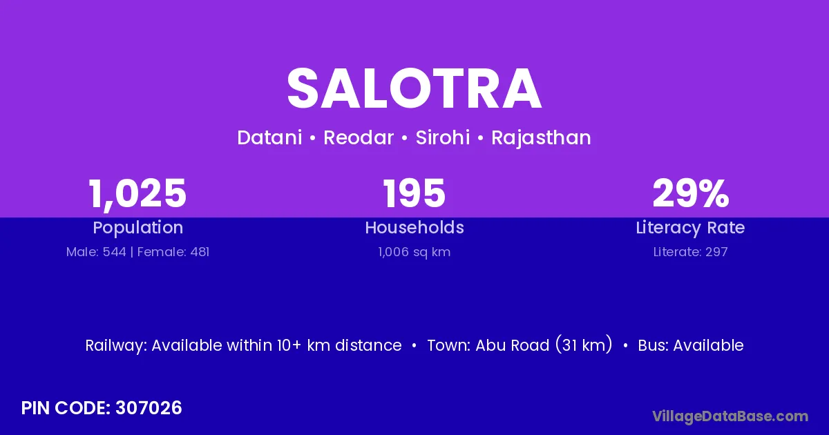 Abu Road (31 km) is the nearest town to Salotra village for major economic activities and is located approximately 31 km away.