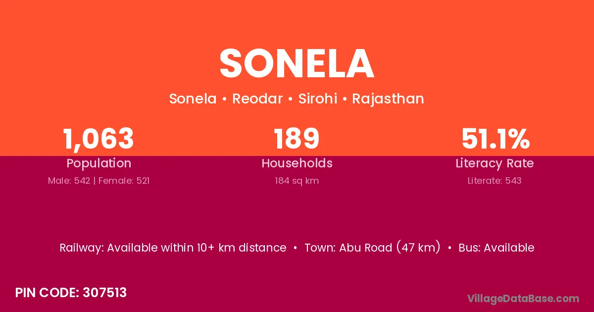 Abu Road (47 km) is the nearest town to Sonela village for major economic activities and is located approximately 47 km away.