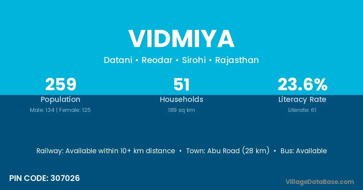 Abu Road (28 km) is the nearest town to Vidmiya village for major economic activities and is located approximately 28 km away.