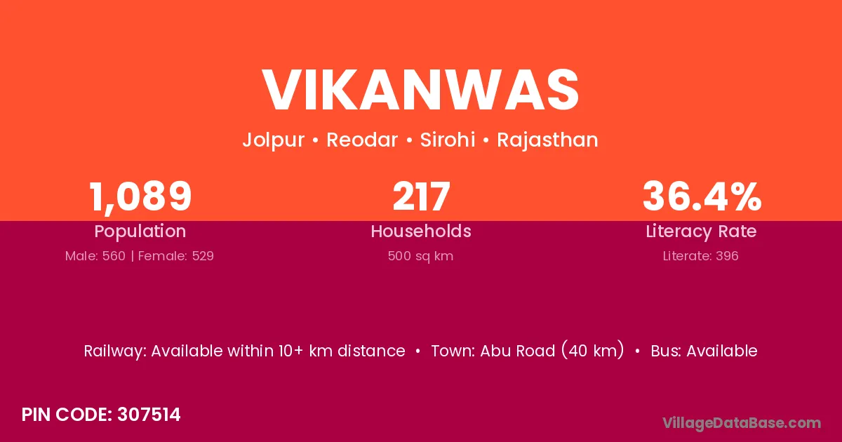Abu Road (40 km) is the nearest town to Vikanwas village for major economic activities and is located approximately 40 km away.