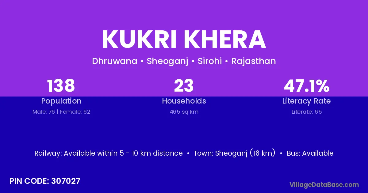 Sheoganj (16 km) is the nearest town to Kukri Khera village for major economic activities and is located approximately 16 km away.