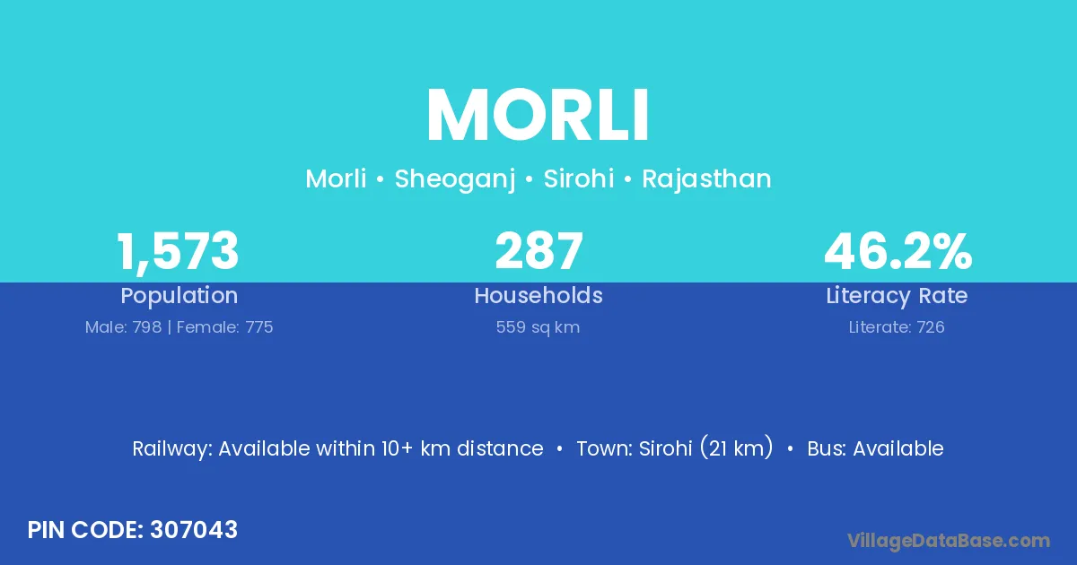 Sirohi (21 km) is the nearest town to Morli village for major economic activities and is located approximately 21 km away.