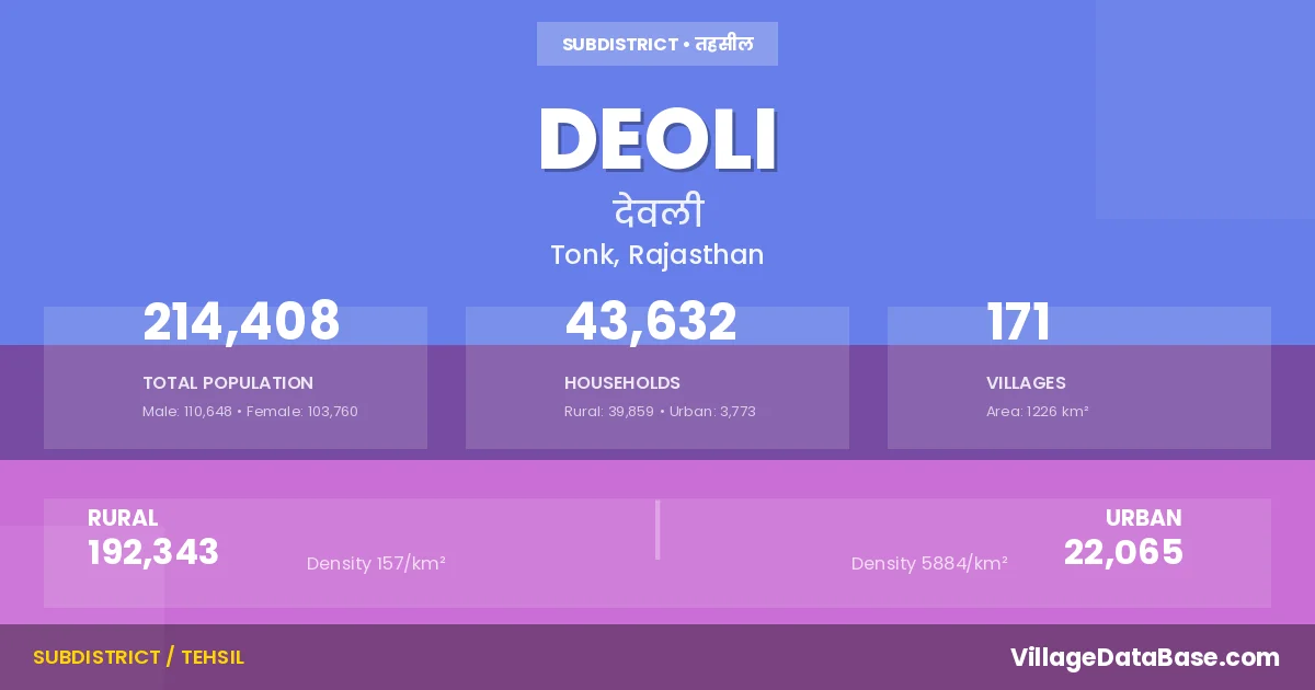 According to the 2011 census The total area of Deoli Tehsil is 1226 km², with a population of 214408 people. The population density is 175 inhabitants per square kilometre, and there are approximately 43632 houses in the sub district.