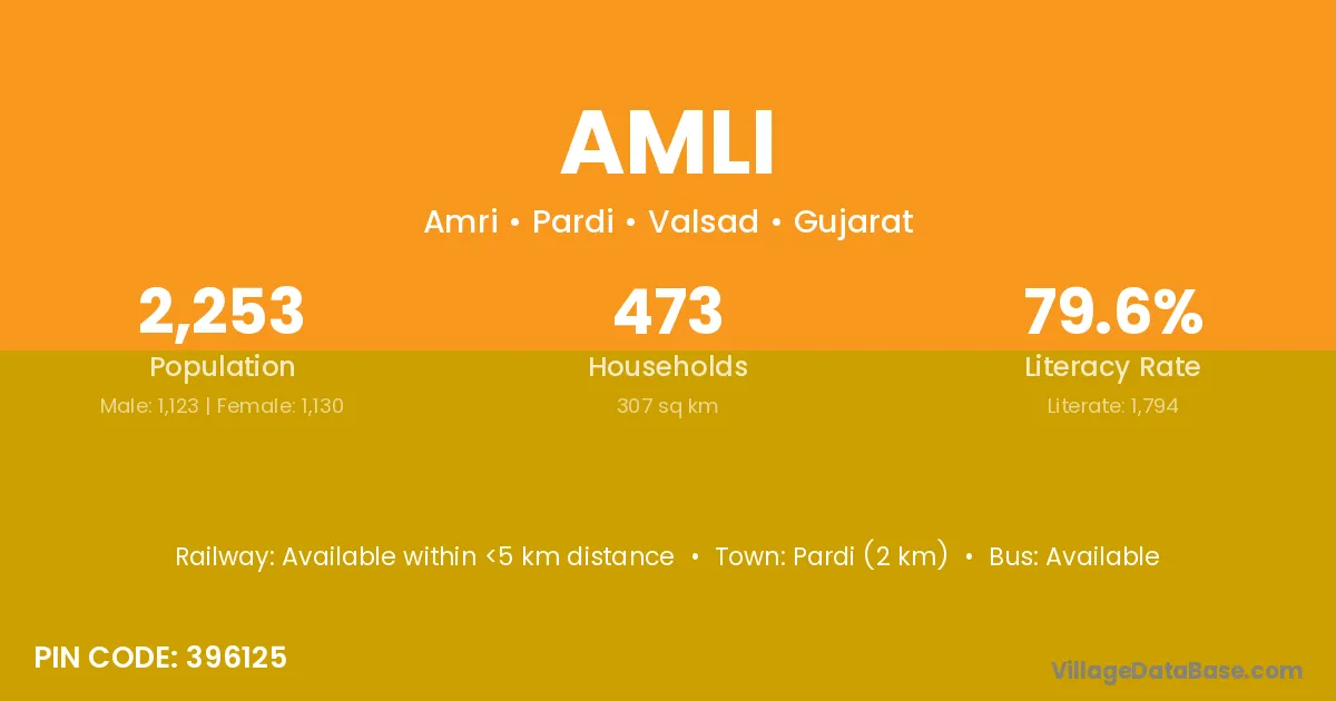 The literacy rate of Amli village is 51.94%. Male literacy stands at 67.67% and female literacy at 34.30%.