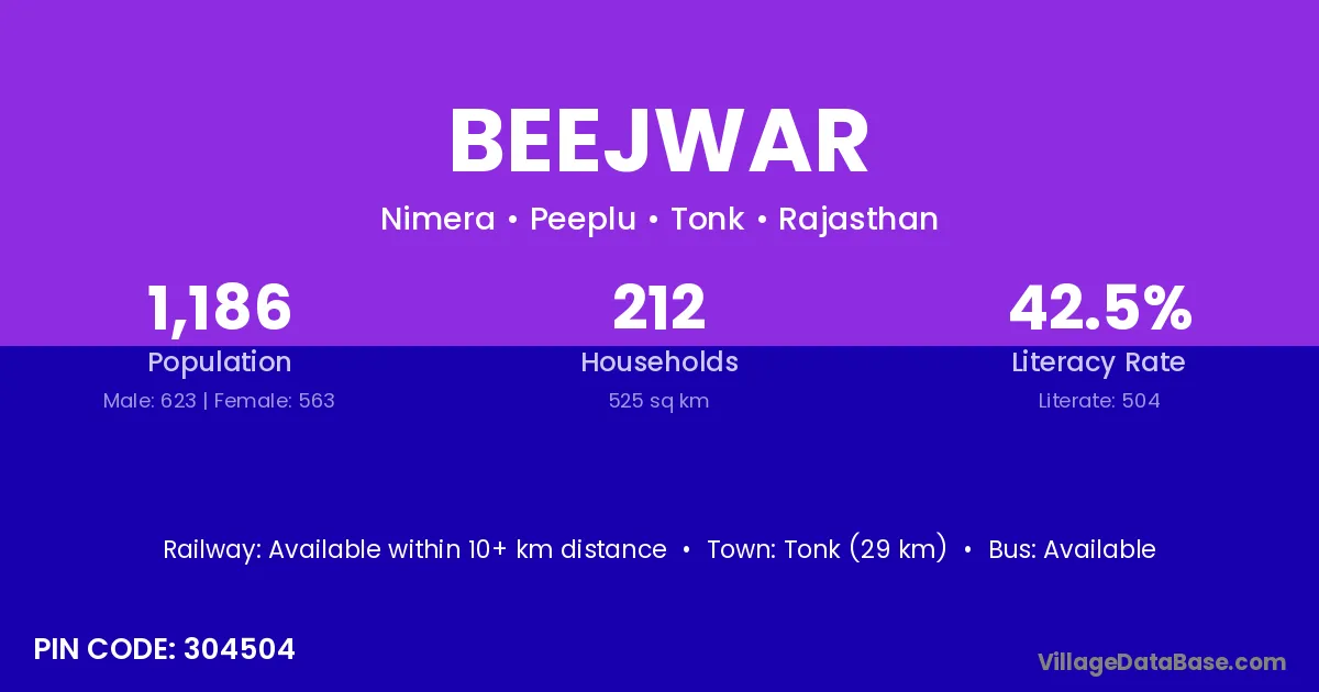 Deoli (25 km) is the nearest town to Beejwar village for major economic activities and is located approximately 25 km away.