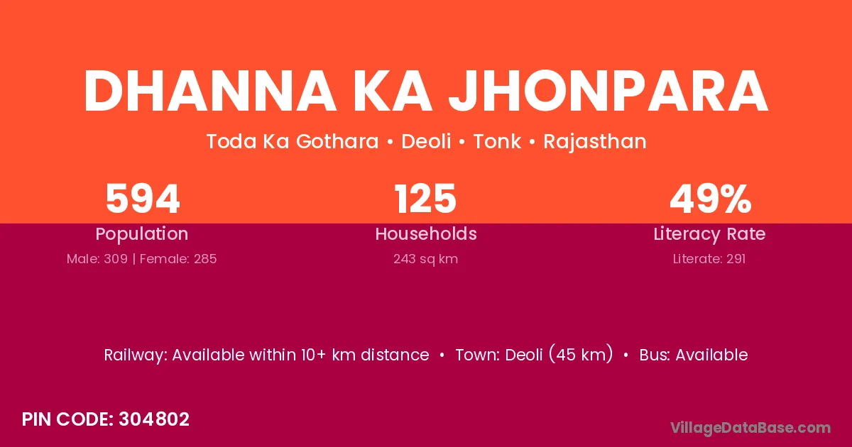 Deoli (45 km) is the nearest town to Dhanna Ka Jhonpara village for major economic activities and is located approximately 45 km away.