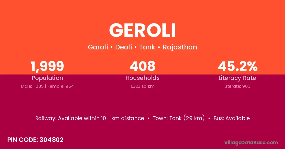 Tonk (29 km) is the nearest town to Geroli village for major economic activities and is located approximately 29 km away.