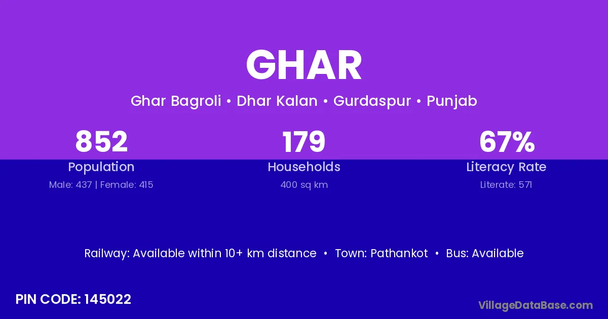 According to Census 2011 information, the village code of Ghar village is 304802.