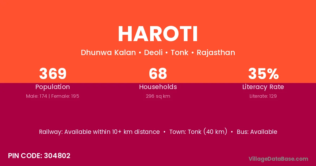 Tonk (40 km) is the nearest town to Haroti village for major economic activities and is located approximately 40 km away.
