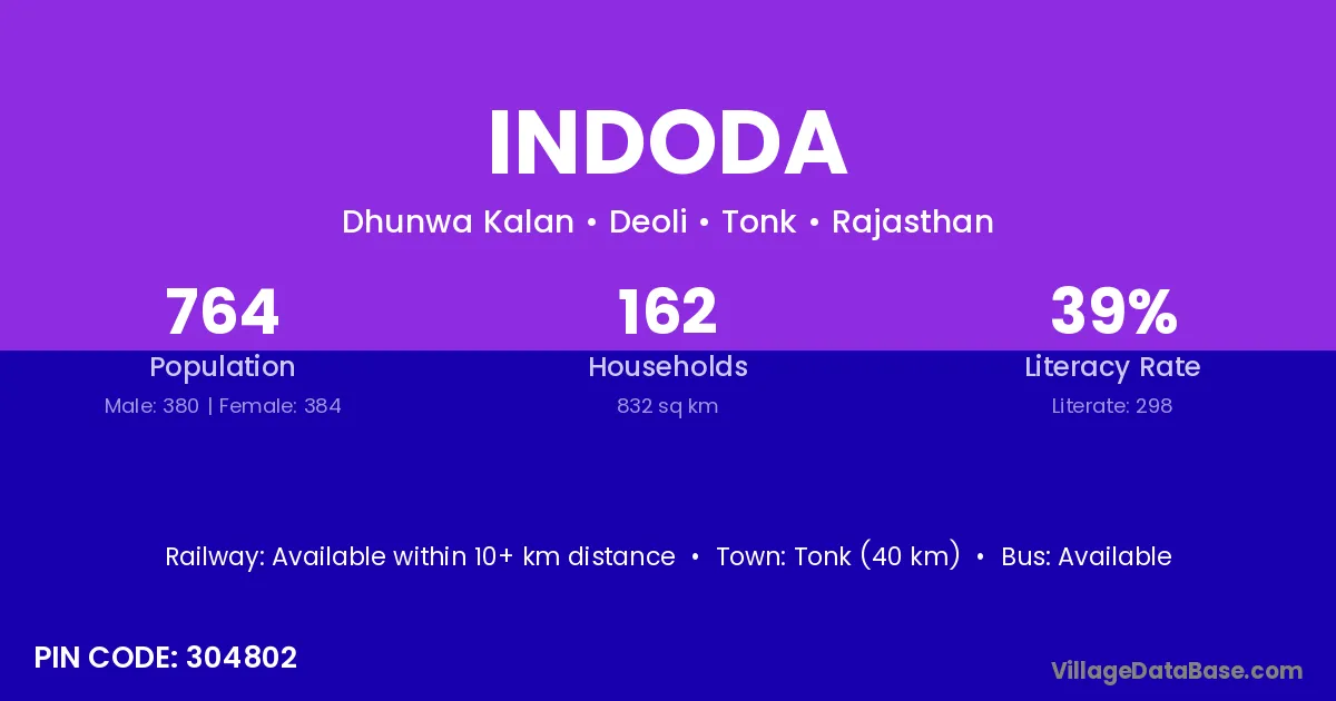 Tonk (40 km) is the nearest town to Indoda village for major economic activities and is located approximately 40 km away.