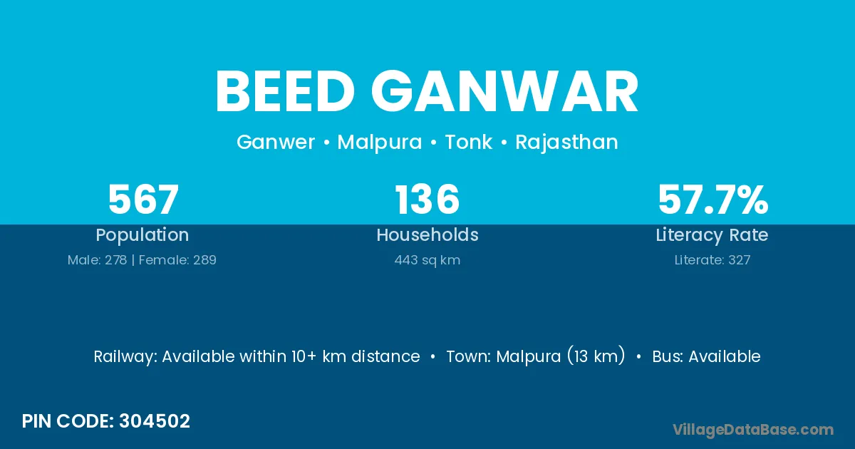 Malpura (13 km) is the nearest town to Beed Ganwar village for major economic activities and is located approximately 13 km away.