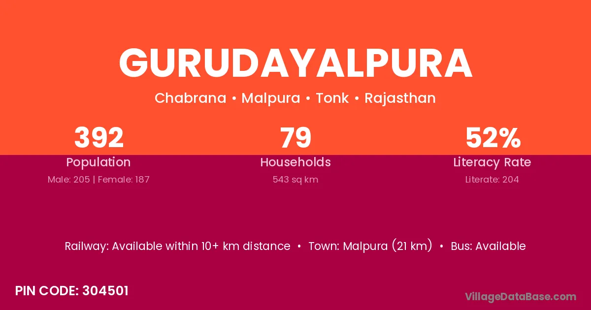 Malpura (21 km) is the nearest town to Gurudayalpura village for major economic activities and is located approximately 21 km away.