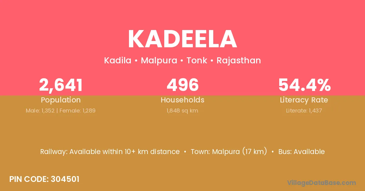 Malpura (17 km) is the nearest town to Kadeela village for major economic activities and is located approximately 17 km away.