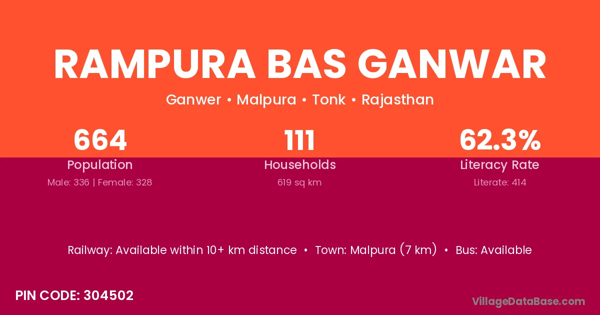 Malpura (7 km) is the nearest town to Rampura Bas Ganwar village for major economic activities and is located approximately 7 km away.