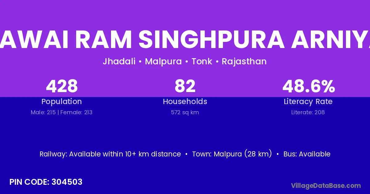 Sawai Ram Singhpura Arniya village has a total population of 428 people, of which 215 are males and 213 are females.