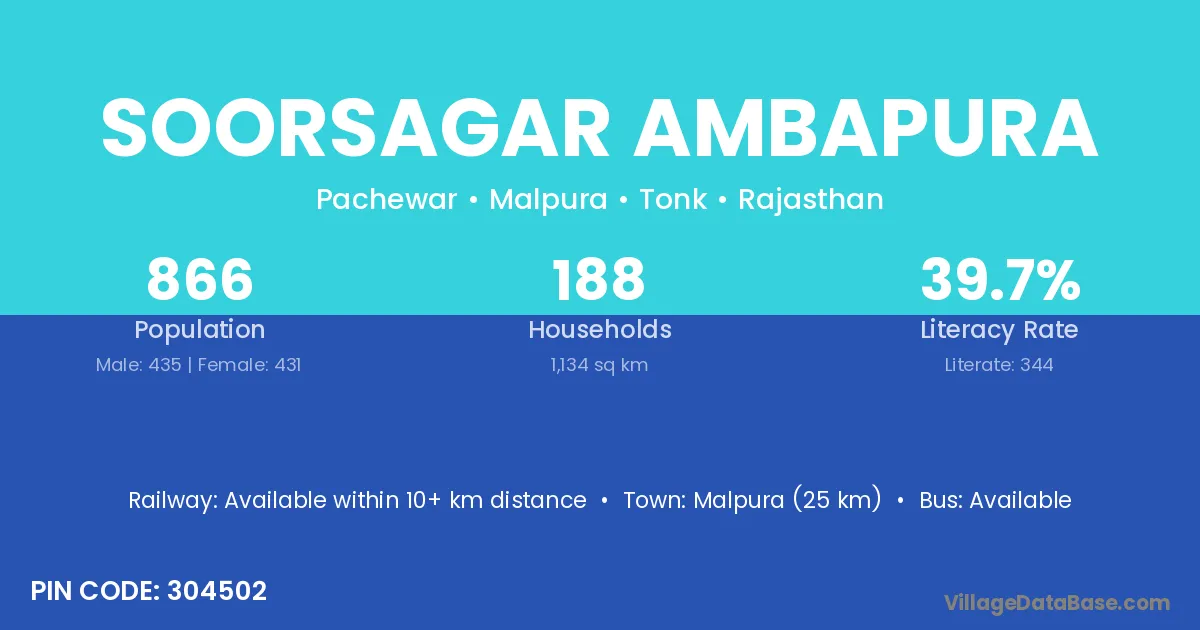 Soorsagar Ambapura village has a total population of 866 people, of which 435 are males and 431 are females.
